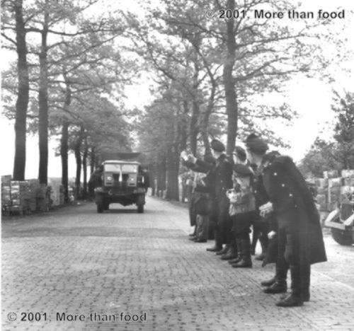 On May 2 The 49th Infantry Division was part of the 1st Canadian Corps and was stationed near Arnhem. Lt. John F Abbott was leading HQ platoon in the 482 Inf. Brig. Coy. Royal Army Signal Corps. He was ordered organize a convoy of 50 trucks and fill them with food. When the trucks were filled they went on their way to Wageningen. The trucks carried white flags, since they were going to cross the frontline. At Wageningen, Lt. Abbott saw Prince Bernhard and a German and an English general standing on the steps of, what appeared to be the town hall. The convoy proceeded its way towards the frontline. At the frontline the convoy ran into a group of Dutch SS-ers. These men acted very hostile. They threw bricks and stones at the convoy. The SS-ers were still armed, but no shots were fired.