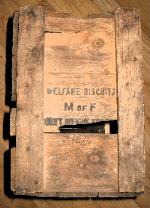 A crate from my collection that holds two tin cans with welfare biscuits which the Canadians drove into Holland with their trucks. Many people believe these this cans with buscuits were dropped by the bombers but that is not the case.