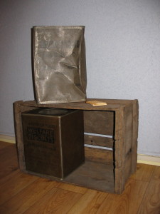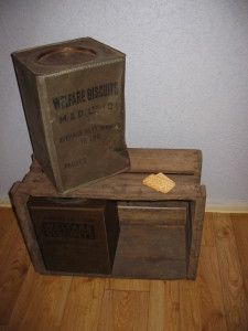 Welfare Biscuits cans. The cans where packed per two in wooden crates as you can see on the photo. On top of the crate you can see the original biscuits. The biscuit cans where not dropped by the aircrafts but they came into Holland during operation faust.