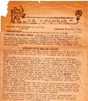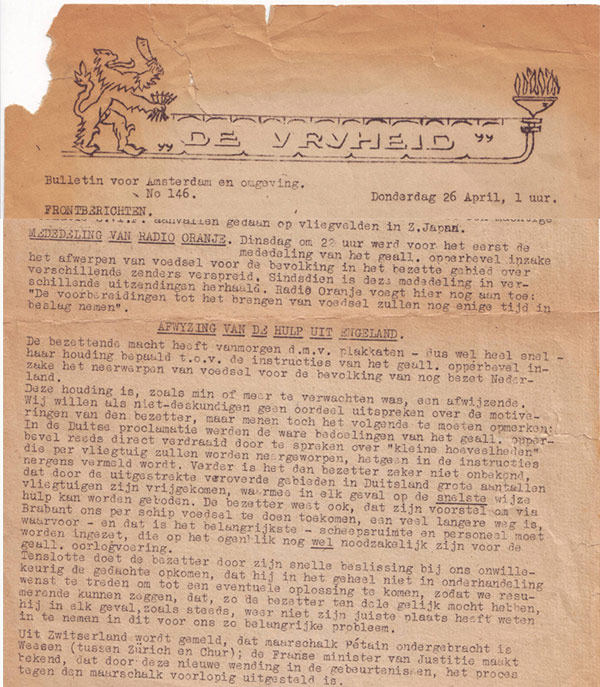 Illegal newspaper, spread by the resistance containing news about the food drop. The newspaper read that the food drop missions where first announced on tuesday 24 april. It further says that the Germans have refused the Allied proposal for food drop mission over occupied Dutch territory.