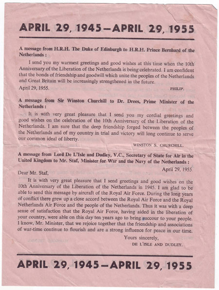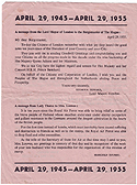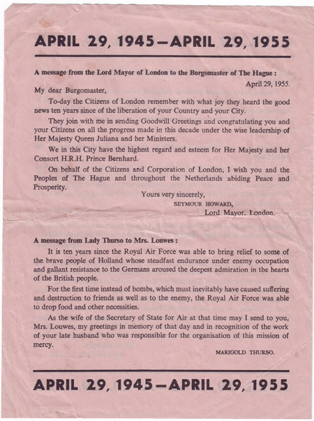 Leaflet commemorating the food drops. Dropped in 1955. Containing messages from Lord Mayor of London to the burgomaster of The Hague (english) and a message from Lady Thurso to Mrs. Louwes