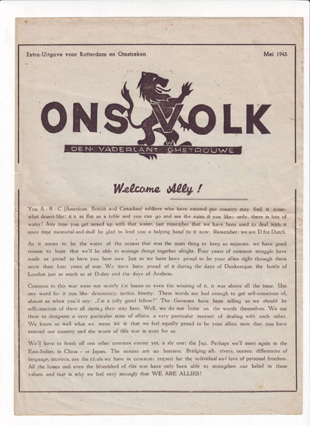Ons Volk - one of the illegal newspapers that was spread by the resistance is welcoming the allies into Rotterdam in May 1945.