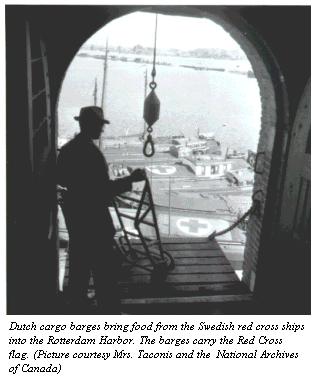 In early October the Dutch government had turned towards neutral Sweden for help. The ties between the Swedish and Dutch royal families were strong, so the Sweden reacted immediately. The Swedish government didn't need much time to get two huge transport ships ready for a trip to Holland. The Noreg and the Dagmar Bratt were filled with food and together they contained 3700 ton food. It took a long time before the German and English government agreed upon the conditions under which both ships could make their trip into occupied Holland. On January 24 both ships left Sweden and four days later they arrived in Delftzijl, the Dutch harbor in northeast of the Netherlands. In Delftzijl the food was loaded onto Dutch river barges and transported further towards Rotterdam. This all happened under the watchful eye of a member of the International Red Cross. On February 27 the Swedish Whitbread was handed out to the citizens of several cities in Holland for the first time.